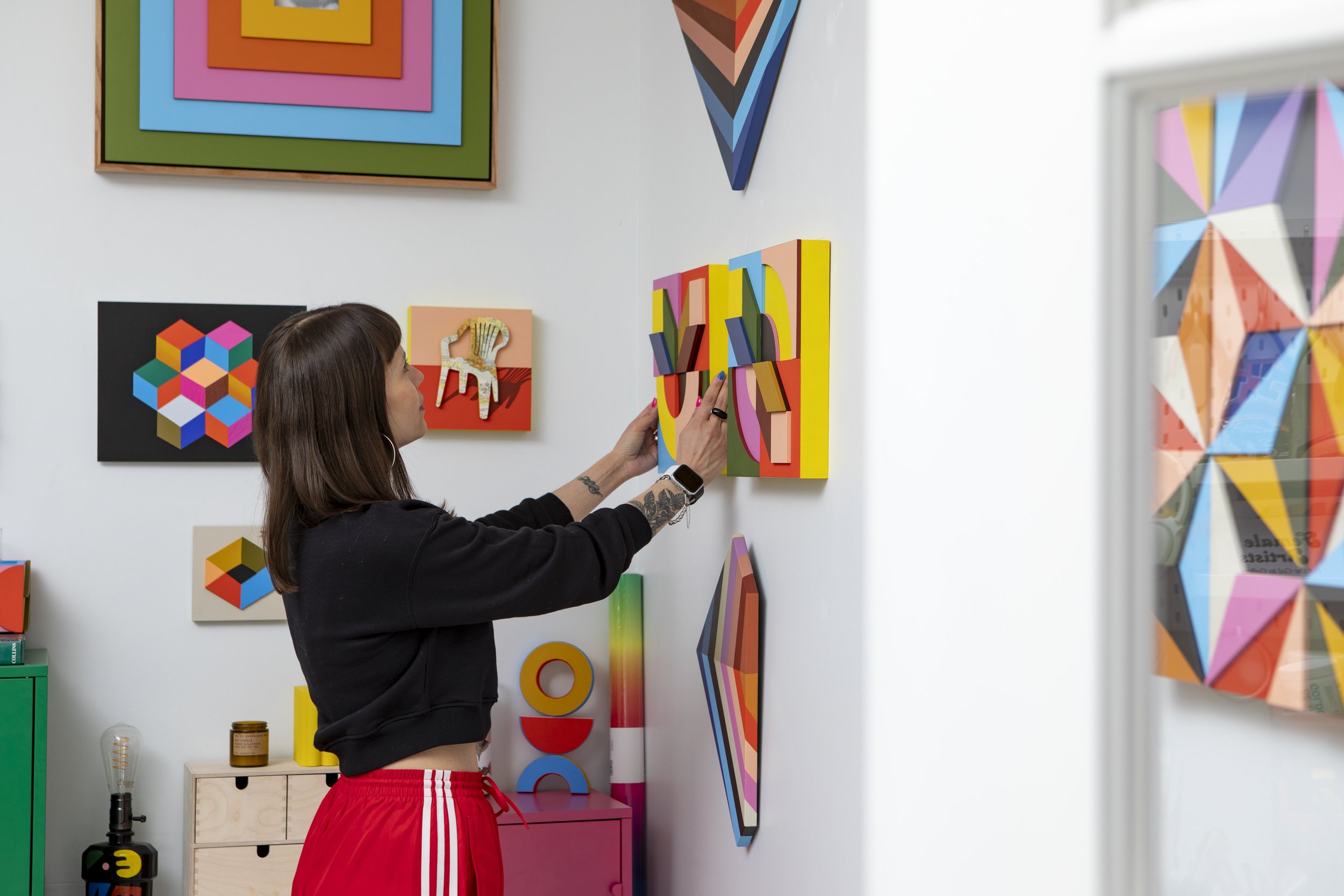 Repetition plays a central role in Angie’s practice. Inspired by her love of Mexican tile design, she uses repetition not just as a visual structure, but as a way to build movement, connection, and intention. The act of repeating becomes an insistence—each geometric piece a bold claiming of space.